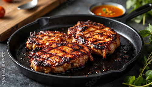 whole kangaroo steak with charred edges, resting on a cast-iron skillet, small bowl of dipping sauce on the side