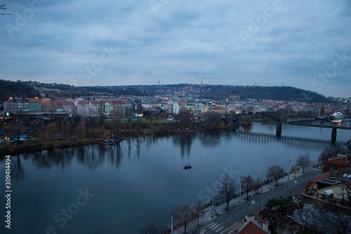 Winter panorama from Vysehrad Castle to the evening city of Prague, residential areas, the Vltava River, moorings with boats and boats and city transport.