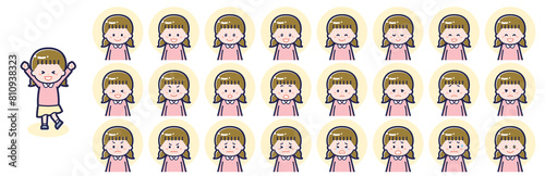 girl, girl, children, kindergarten, preschool, private, waist up, front, smile, joyful, fun, happy, positive, happy, enjoyment, positive, light, lively, surprise, surprised, sad, stern, depression, spicey, repentance, embarrassment, impatience, apprehension, anger, anger, moody, expression, feeling, icon, pose, sweet, people, set, infographic, illustration, vector