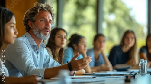 08080717 36 In a seminar room, a professor leads a discussion with a small group of students who are seated around a large table, listening and contributing ideas.