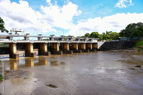 09.29.2024 Sri lanka , Sluice gate gearbox rolling controls chain , empty reservoir , technology dam, industry environment, Hydroelectric dam, drought season situation, mechanism