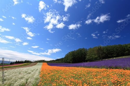 hokkaido, lavandula, poppy, flower garden, july, blue skies, nature, full bloom, sky, flower, blue, plant, midsummer, summer, landscape, cloud, tourist attraction, light, lovely