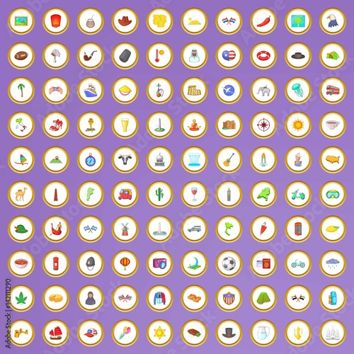 100 around the world icons set in cartoon style