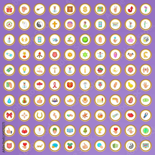100 care and help icons set in cartoon style