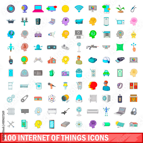 100 internet of things icons set, cartoon style