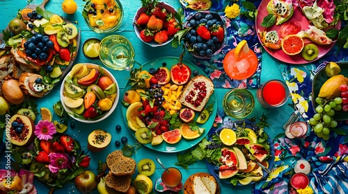 100. Overhead shot of a vibrant picnic spread with sandwiches, fruit, and drinks