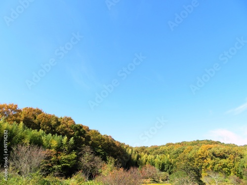 日本の田舎の風景 11月 黄葉 山の木々と青空