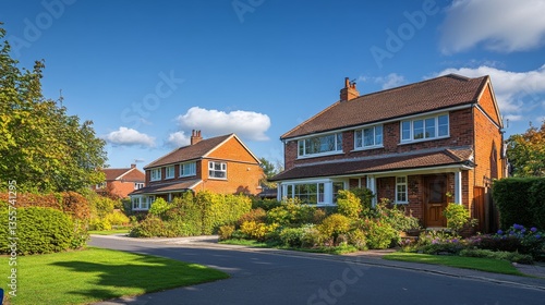 115.A peaceful suburban semi-detached home, showcased on a bright sunny day, with a beautifully landscaped front garden and clear blue sky