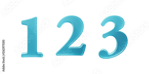 1.2.3. numbers are frontal in angle, shimmering translucent in texture, light blue in color, round in shape