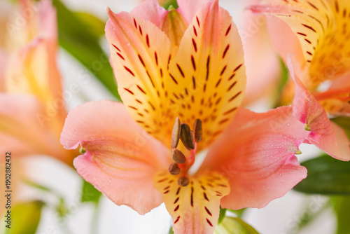 ピンクとオレンジ色のアルストロメリアの花を白背景で室内撮影13