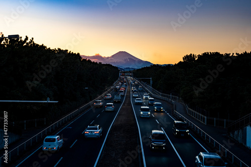 bypass, way, fuji, kamakura, kanagawa, fuji, sunny, sunset, dusk, sunset, evening, sunset, winter, blue skies, route, mountain, nature, landscape, car, car, transportation, drive, rear lamp, silhouette, nightscape, auto, sun, open air, japan