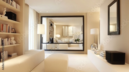 contemporary, living, room, shelving, unit, book, decorative, object, stylish, pouf, large, mirror, reflecting, modern, charme, minimalist, design, offer, clean, roomy, environment, neutral, tone, creating, calm, inviting, atmosphere, are, both, functional, aesthetic, adding, overall, attracted