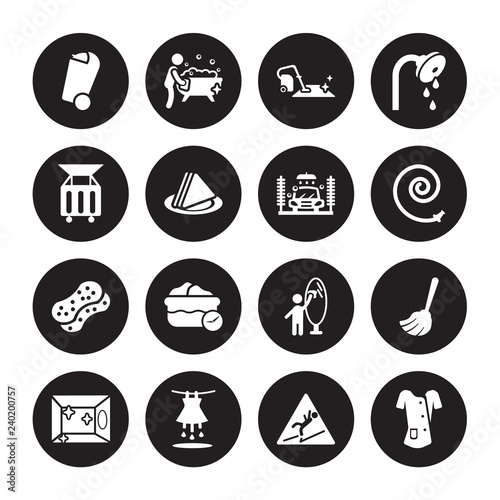 16 vector icon set : Bin, Slippery, Soak, Clean Room, Floor mop, Cleaner Uniform, Dumpster, Sponges, Car wash isolated on black background