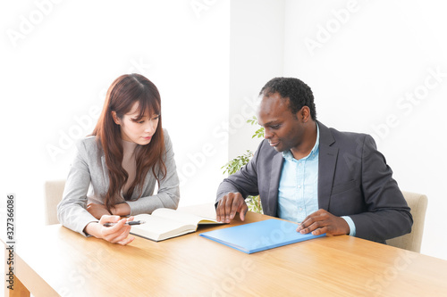 meeting, office, office, discussion, corporation, boardroom, discussion, conference, planning, conversation, english, international, global, diversity, international, culture, two people, communication, meeting, suit, consultation, meeting, rehearsal, gesture, career woman, businessman, salesman, alien, man, woman, asian, japanese, chinese, korean, black man, white background, copy space