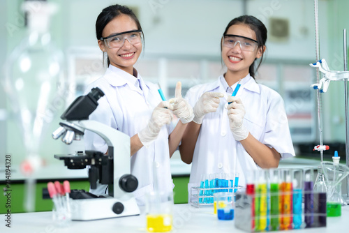 2 female scientist presenters are doctors Working in a chemistry lab Smiling and pointing at test tubes for producing vaccines, beakers, microscopes for making vaccines and treating diseases.