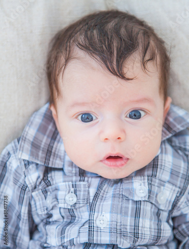 baby boy, baby, boy, portrait, 1, person, cute, adorable, children, children, childhood, youth, innocence, sweet, innocent, infant, emotion, newborn, born, home, home, sofa, sitting, shirt, blue eye, brown hair, serious, starring