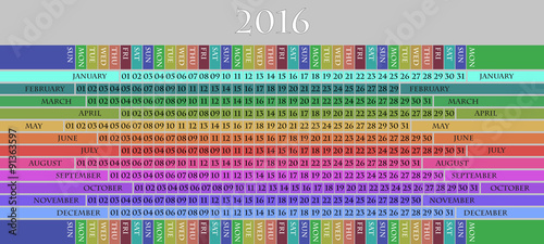 2016, 16, calendar, year, new, english, language, basic, diary, month, time, number, october, november, season, season, day, week, monthly, modern, september, june, office, background, february, august, annual, december, colours, colourful, planner, april, july, date, page, vector, may, daily, schedule, event, graphic, style, disrobed, organiser, element, stripes, stripes, jan, march, illustration