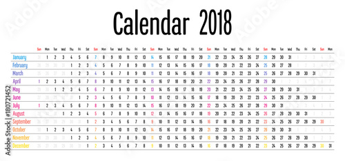 calendar, 2018, sunday, monday, tuesday, wednesday, th, friday, jan, february, march, april, may, june, july, august, september, october, november, december, year, month, date, simple, clear, vector, illustration, week, cmyk, cyan, blue, magenta, hot pink, yellow, english, annual, organiser, design, planner, schedule, diary, day, template, event, business, office, white, black, memo