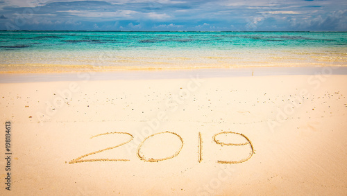 2019 handwritten in sand of tropical beach. New Year's concept.
