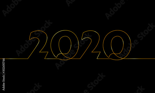 2020 New Year single continuous line art. Golden black holiday greeting card headline decoration. Date numbers lettering silhouette concept design. One sketch outline glowing gold vector illustration