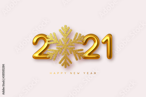 2021 Happy New Year sign. 3d golden glitter snowflake with 3d metallic golden numbers on white background. Vector illustration.
