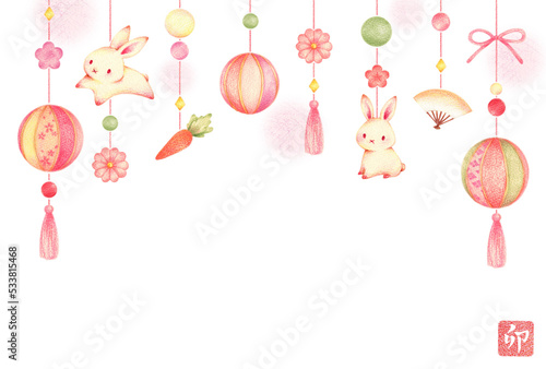 吊るし手毬とうさぎの2023年の年賀状 横 背景あり 手描き色鉛筆画