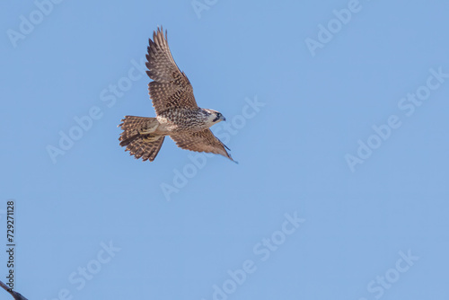 狩りのために飛翔する美しいウスハヤブサ(ハヤブサ科)。 日本国栃木県栃木市、渡良瀬遊水地にて。 ラムサール条約登録地。 2024年2月3日撮影。 Beautiful USU-Peregrine Falcon (Subspecies of falcons) (Falco peregrinus calidus, family comprising Falco falcons) in flight
