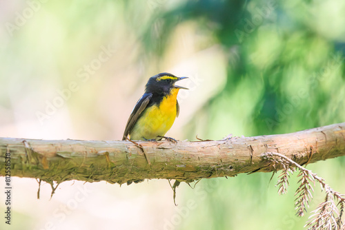 新緑の林で美しくさえずる可愛いキビタキ(ヒタキ科)。 日本国東京都八王子市、八王子城跡にて。 2024年5月撮影。 A lovely Narcissus Flycatcher, (Ficedula narcissina, family Cyanopterygidae) singing beautifully in in the fresh greenery woods.