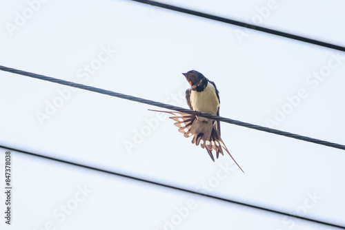 羽繕いする美しいツバメ(ツバメ科)。 日本国東京都あきる野市、日の出山登山道他。 2024年6月撮影。 Beautiful Barn swallow (Hirundo rustica) grooming their wings. Mt. Hinode-yama Trail road, Akiruno City, Tokyo, Japan. - June 2024.