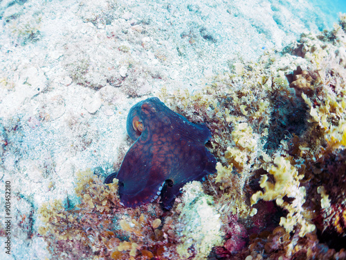 岩の間に隠れる大きな美しいワモンダコ(マダコ科)。 日本国静岡県伊豆半島賀茂郡南伊豆町中木から渡し船で渡るヒリゾ浜-2024年7月 A big beautiful Big Blue Octopus (Octopus cyanea) hiding among the rocks.