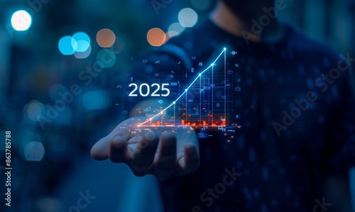 2025, growth, technology, future, progress, innovation, chart, graph, hologram, hand, digital, abstract, blue, red, year, datum, business, success, forecast, trend, optimism, vision, opportunity, advancement, upward, development, evolution, transformation, tech, modern, cyber, virtual, concept