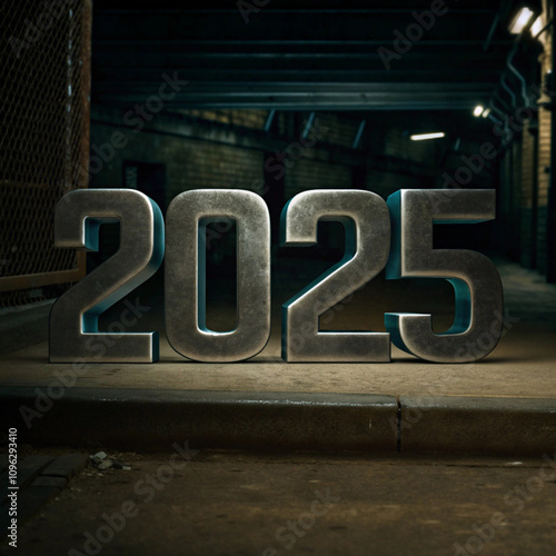 2025, new year, new year's eve, countdown, metallic, metal, steel, grunge, urban, city, alleyway, dark, night, futuristic, technology, future, anticipation, hope, change, time, year, calendar, number, digit, abstract, background, texture, design, graphic, illustration, concept, dark background, street, pavement, suppressing