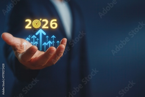 2026 business growth forecast,concept of progress and upward movement,hand holding glowing icons with arrows pointing up,visual symbol for positive financial performance