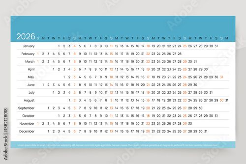 2026 calendar. Linear calender template. Annual organizer. Week starts Sunday. Horizontal scheduler. Yearly planner layout. Long grid with 12 month, English. Landscape orientation. Vector illustration