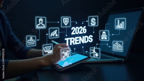2026 trends visualized on a digital tablet and laptop.