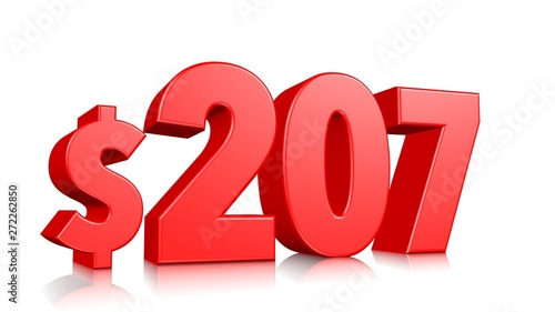 207$ Two hundred seven price symbol. red text number 3d render with dollar sign on white background