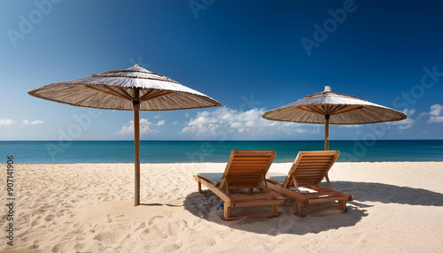 美しい砂浜のビーチを描いています。クリアな青空の下に、2つのビーチパラソルと2つの木製のビーチチェアが並んでいます。遠くに見える穏やかな海と白い砂がリゾート感を強調し、リラックスした雰囲気を醸し出しています。影が砂に映り、太陽の明るさが感じられます。generative AI
