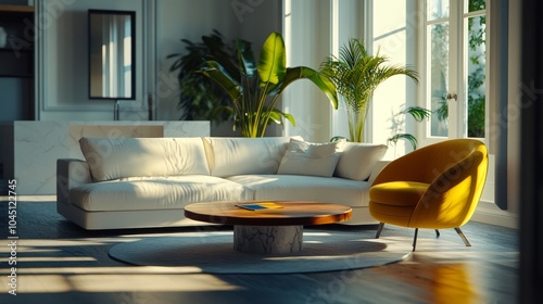 2410 9.A stylish living room interior with a cozy white L-shaped sofa and a bold yellow armchair, centered around a sleek wooden-top table supported by marble legs, the room bathed in warm sunlight,