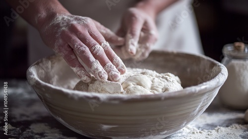 2410_020.intimate view of dough-making process, flour-covered palm in ceramic mixing bowl, subtle textures, diffused light, monochromatic baking imagery, emphasis on craftsmanship