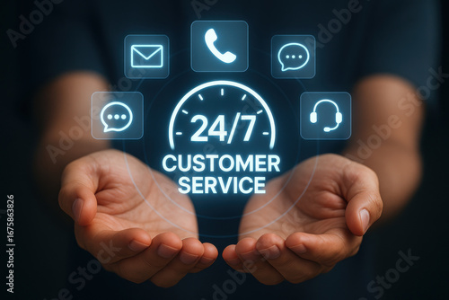 24/7 customer service with communication icons and hands offering support