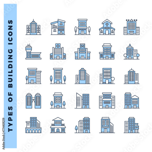 25 Types of Building Two Color icon pack. vector illustration.