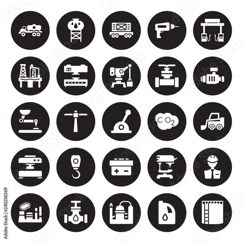 25 vector icon set : Fuel truck, Oil, Refinery, petrol Pipe, Industry, Pump, Co2, industrial Battery, Machine press, Oil industry, Train cargo, Water tank isolated on black background.