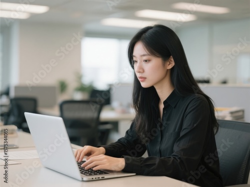asian woman, typing, laptop, office, professional, work, focused, business, modern, corporate, technology, young adult, career, working, computer, task, efficient, productive, contemporary, stylish, serious, concentrated, indoor, workplace, colleague, desk, job, digital, screen, keyboard, employee, meeting, deadline, project, formal, ambition, success, motivated, dedicated, organised, minimalist