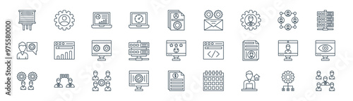 27 set of outline project management icons such as structure, profile, dashboard, workflow, server, monitor, bill, team management vector thin line icons for web design, mobile app.