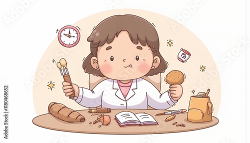 2D Flat Chibi Cartoon Character of a Dietitian - Busy Dietitian working at her desk, surrounded by food and a clock, signifying time management and healthy eating habits - Isolated on white background