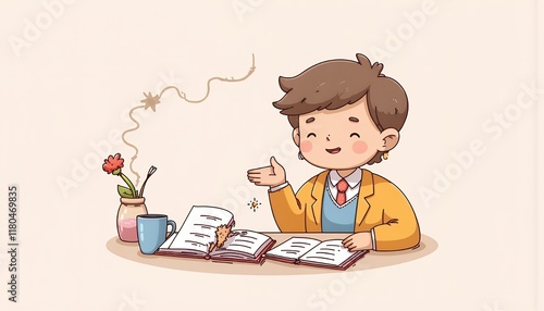 cartoon, character, writer, author, notebook, crayons, cup, flower, desk, table, flat, illustration, drawing, cute, adorable, happy, joyful, creative, writing, storytelling, book, journal, diary, imagination, inspiration, idea, concept, design, art, digital, pixel, manga, anime, children, boy, work, office, study, student, learning, isolated, white, background, portrait