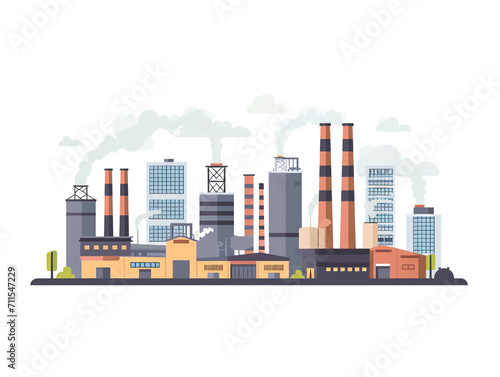 2D flat design illustration of the factory and industrial area. Façade skyline. Smoke pollutes the air.