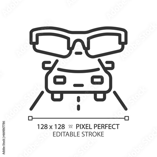2D pixel perfect editable black car and eyeglasses icon, isolated simple vector, thin line illustration representing eye care.