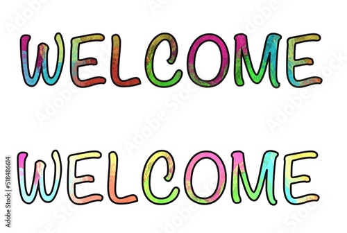 2x “Welcome“ lettering / word - Noteworthy - colorful - black border - capital letters