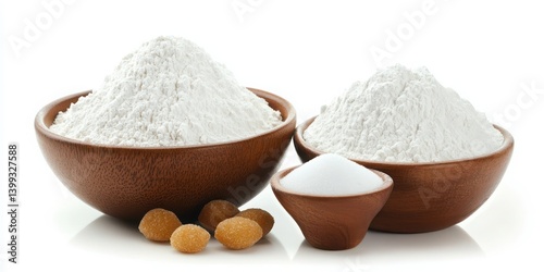 3 bowl of raw ingredients like flour, sugar, and baking soda, isolated with white background